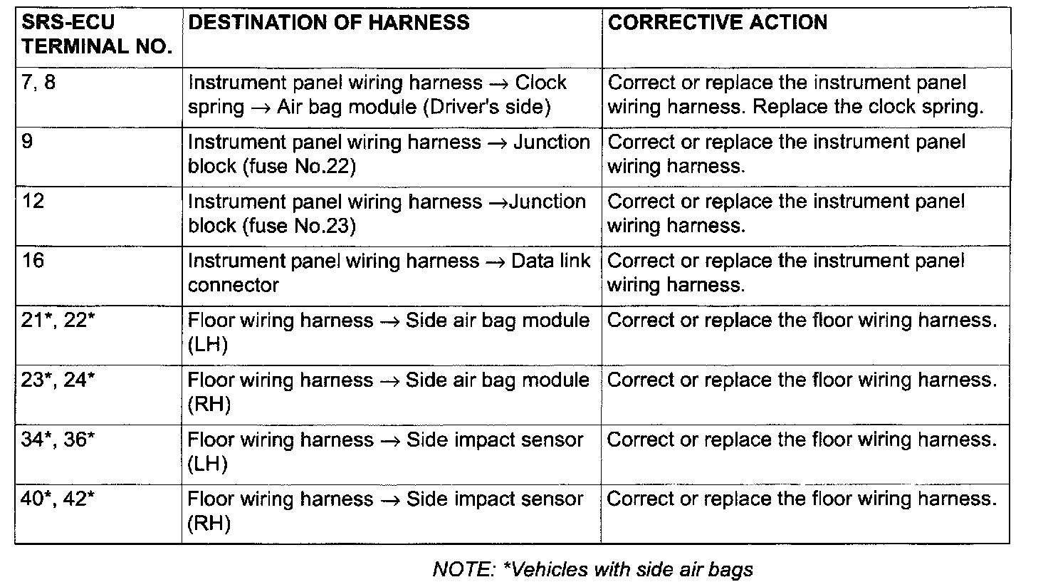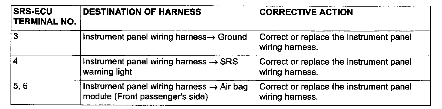 - Do not attempt to repair the wiring harness connectors of the SRS. If any of the connectors are diagnosed as faulty, replace the wiring harness. If the wires are diagnosed as faulty, replace or repair the wiring harness according to the following table.