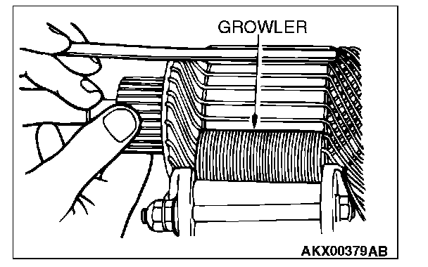 3. Hold a thin steel blade parallel and just above the armature while slowly rotating in the growler. A shorted armature will cause a blade to vibrate and be attracted to the core. Replace the shorted armature.