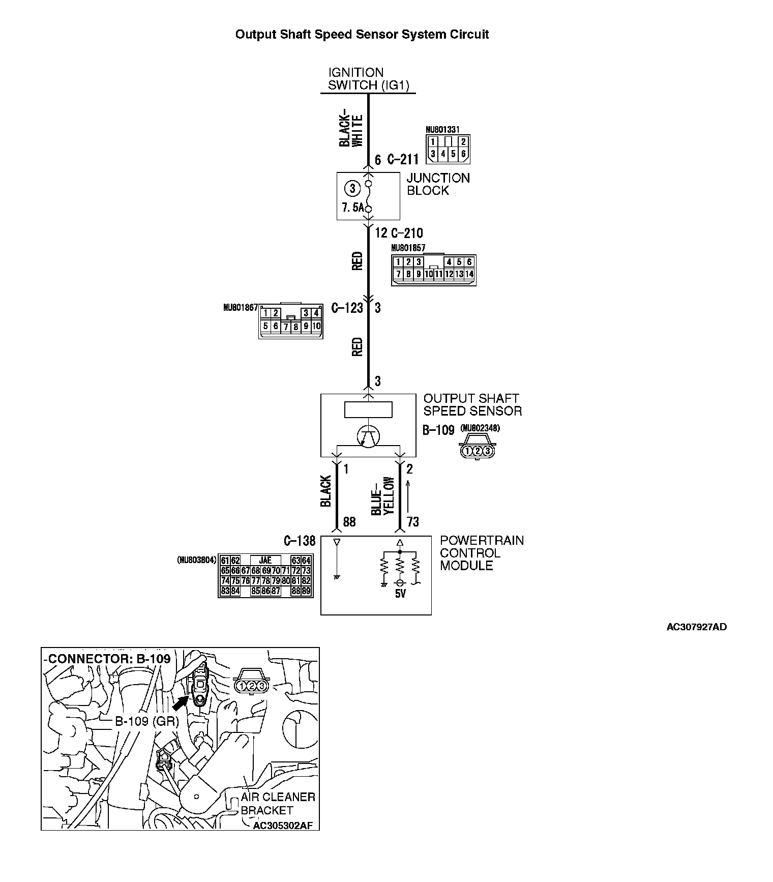 ^ The output shaft speed sensor is connected to the PCM (terminals 73 and 88) via the output shaft speed sensor connector (terminals 1 and 2).