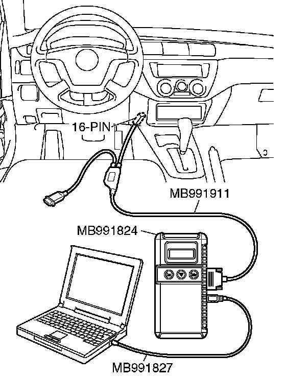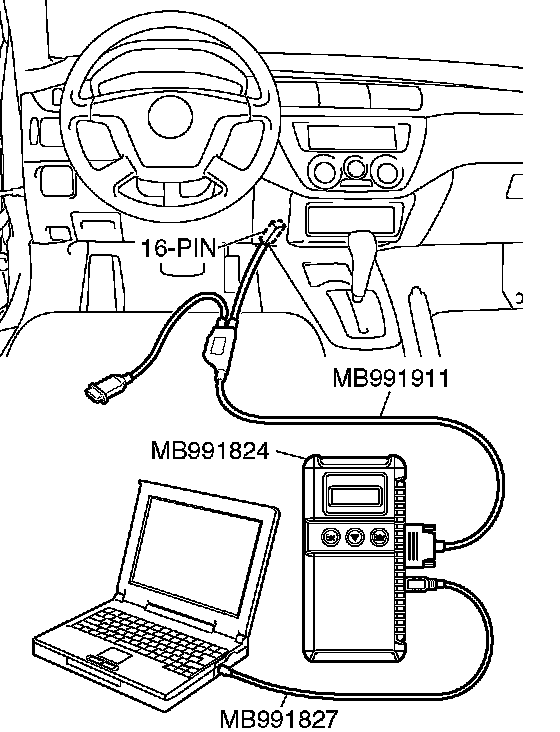 CAUTION: To prevent damage to scan tool MB991958, always turn the ignition switch to the "LOCK" (OFF) position before connecting or disconnecting scan tool MB991958.