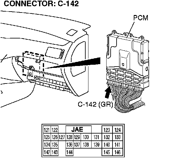 STEP 11. Check A/T control solenoid valve assembly connector B-15 and PCM connector C-142 for loose, corroded or damaged terminals, or terminals pushed back in the connector.