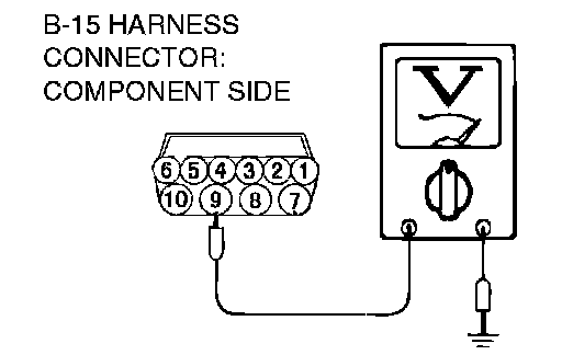 3) Measure the voltage between harness connector B-15 terminal 9 and ground.