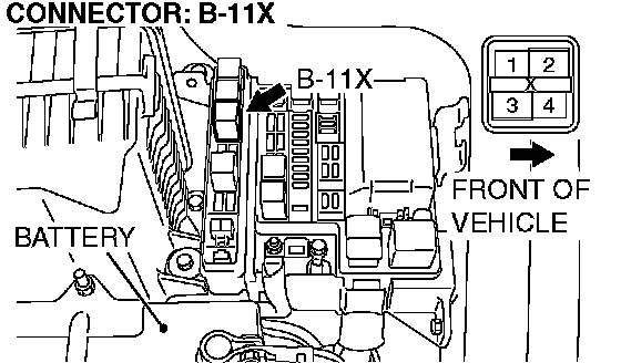 STEP 10. Check the harness for an open circuit or short circuit to ground between A/T control relay connector B-11X terminal 4 in the engine component relay box and A/T control solenoid valve assembly connector B-15 terminal 9.