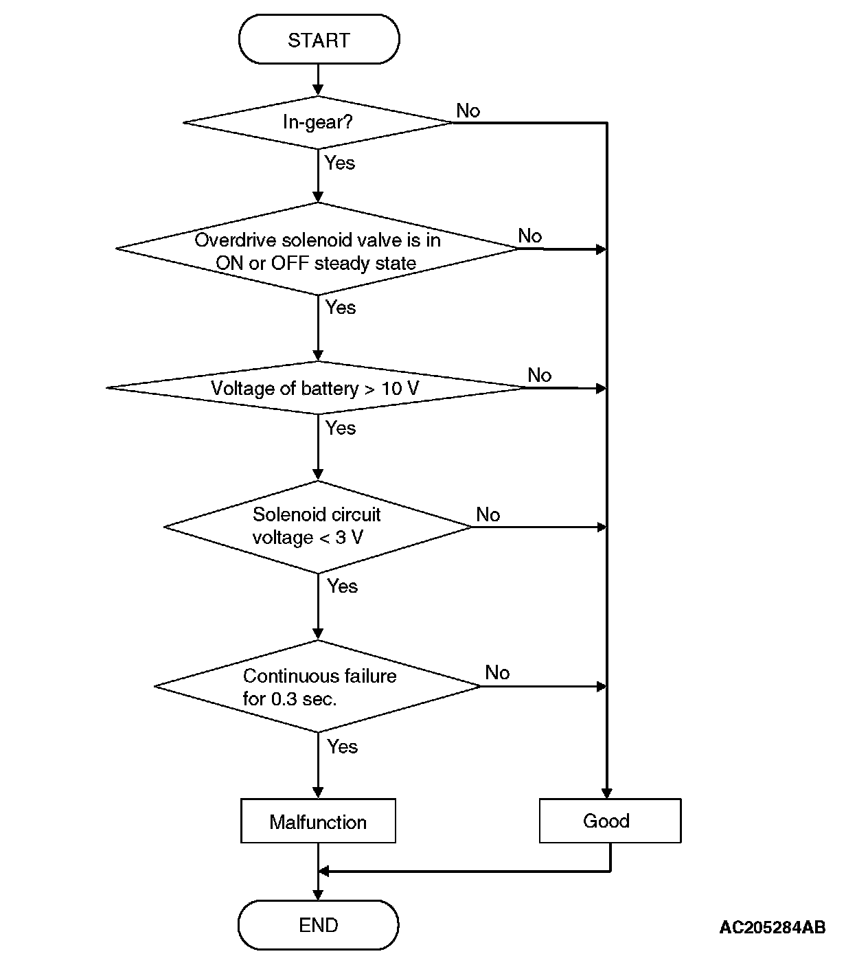 ^ If solenoid terminal voltage is below specified value when shift control is not in progress, PCM judges that overdrive solenoid valve has a failure.