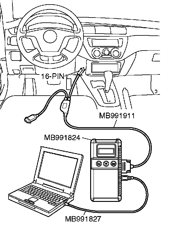 CAUTION: To prevent damage to scan tool MB991958, always turn the ignition switch to the "LOCK" (OFF) position before connecting or disconnecting scan tool MB991958.
