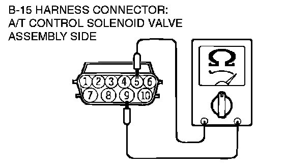 2) Measure the resistance between solenoid valve assembly connector B-15 terminals 5 and 9.
