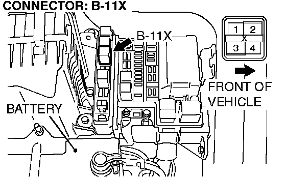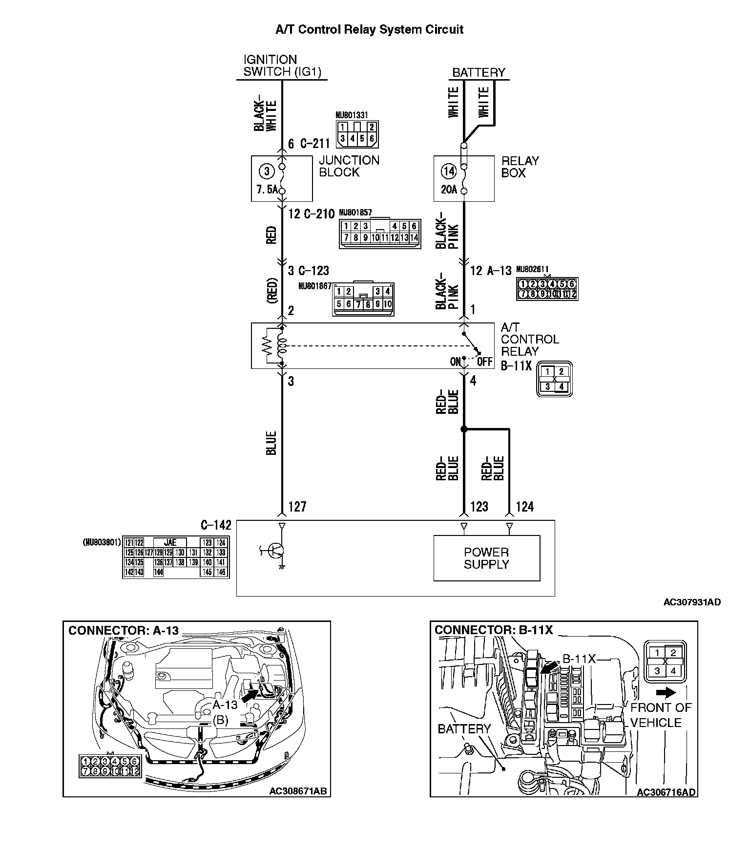 1) Remove the A/T control relay from the engine component relay box connector B-11X.