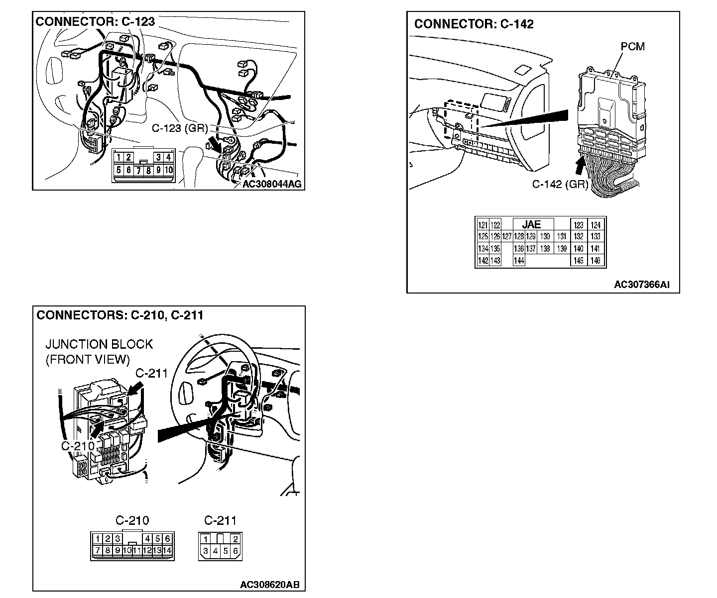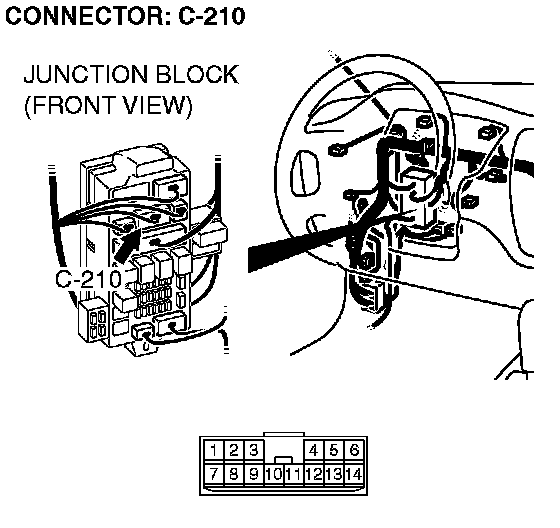 STEP 8. Check intermediate connector C-123 and junction block connector C-210 for loose, corroded or damaged terminals, or terminals pushed back in the connector.