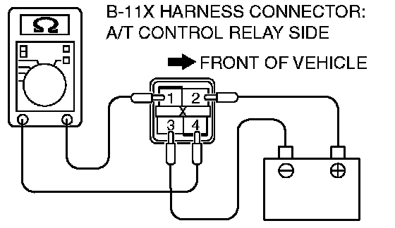 3) Measure the resistance between terminals 1 and 4 of the A/T control relay.