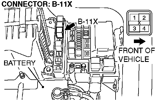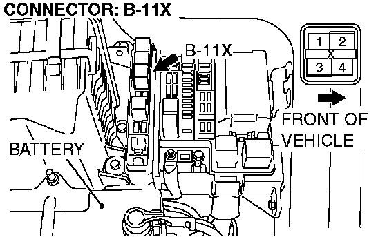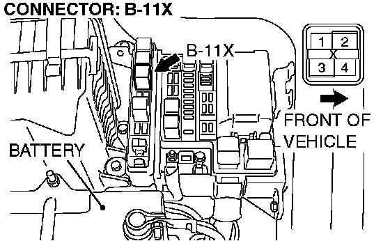 STEP 6. Check the harness for open circuit or short circuit to ground between A/T control relay connector B-11X terminal 1 in the engine component relay box and battery.