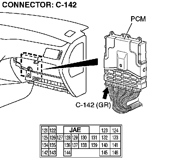 STEP 11. Check PCM connector C-142 for loose, corroded or damaged terminals, or terminals pushed back in the connector.