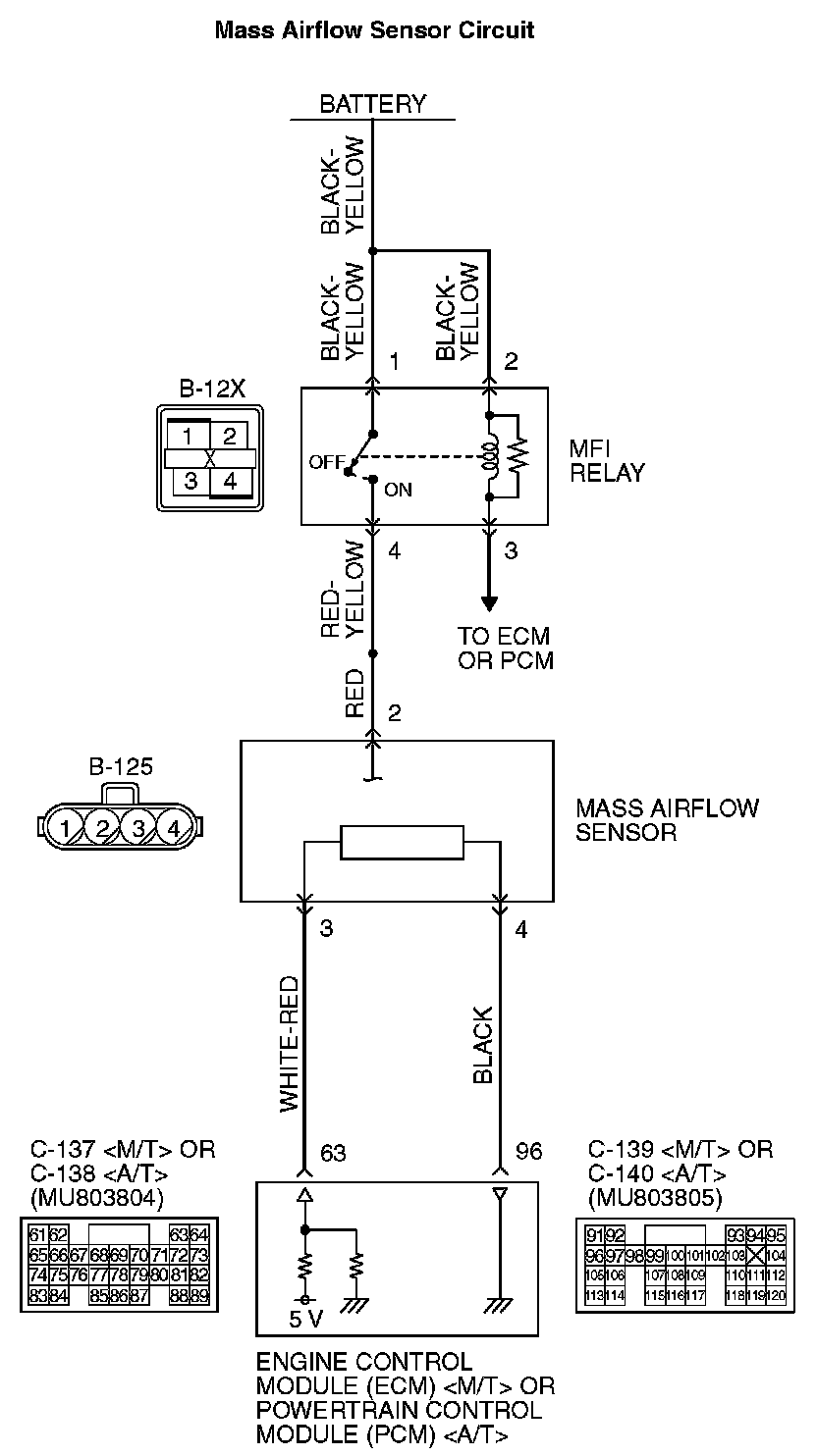 - The mass airflow sensor power is supplied from the MFI relay (terminal No. 4), and the ground is provided on the ECM