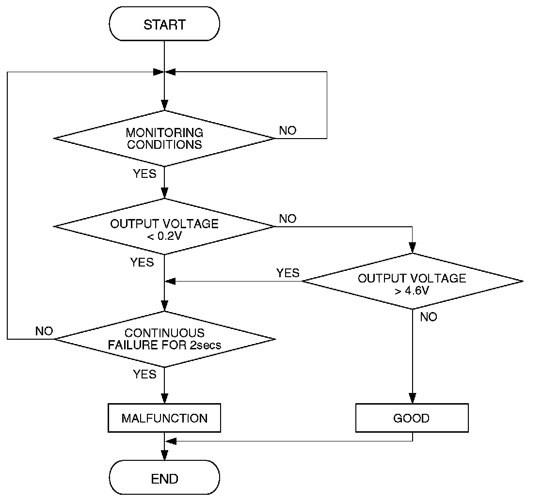 - Intake air temperature sensor output voltage has continued to be 4.6 volts or higher [corresponding to an air intake temperature of -40 degree C ( -40 degree F) or lower] for 2 seconds.