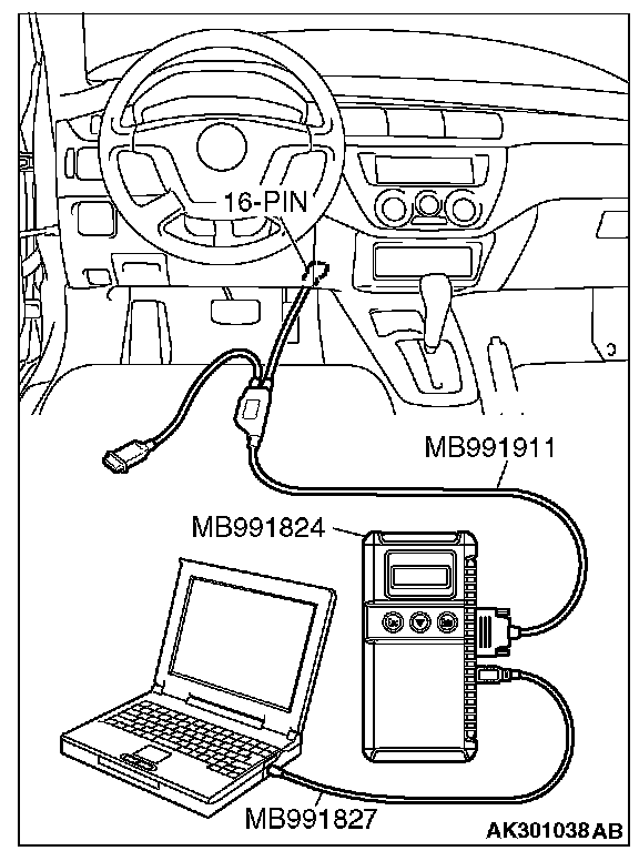 CAUTION: To prevent damage to scan tool MB991958, always turn the ignition switch to the "LOCK"(OFF) position before connecting or disconnecting scan tool MB991958.