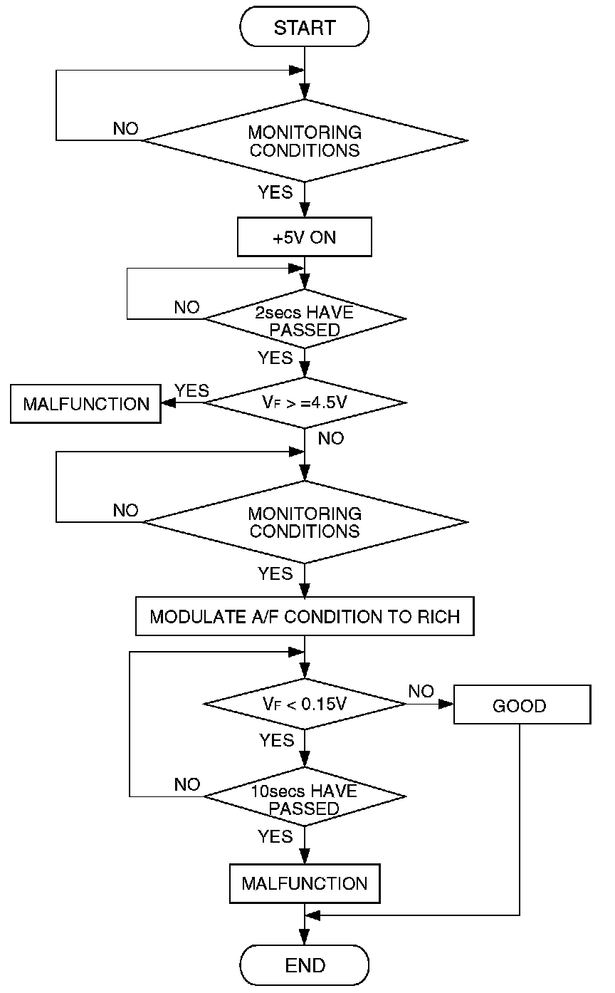 Heated oxygen sensor (rear) circuit is switched to 5 volts intentionally when oxygen sensor output is low, and detects the malfunction if the output voltage changes to equal or greater than 4.5 volts. The above procedure is repeated when oxygen sensor is inactive.