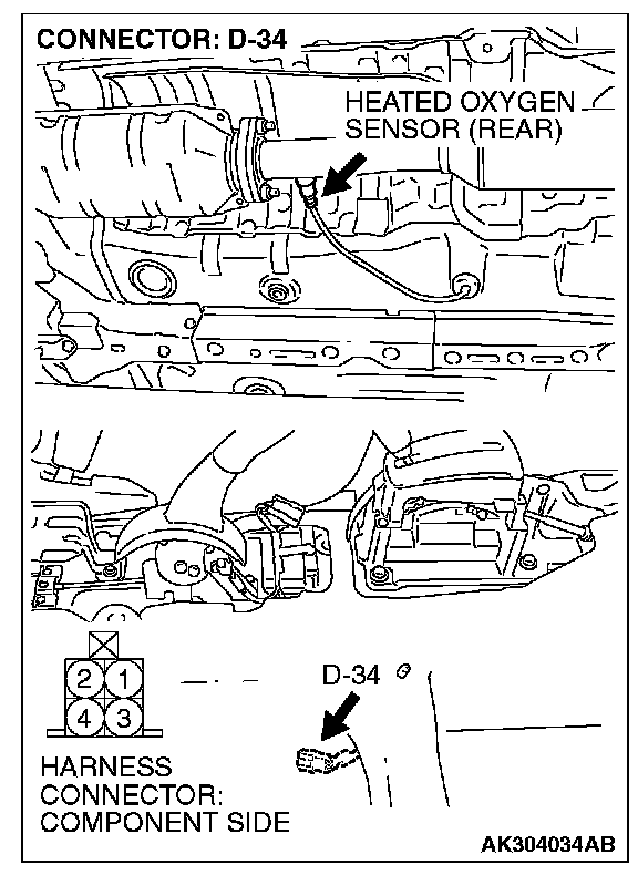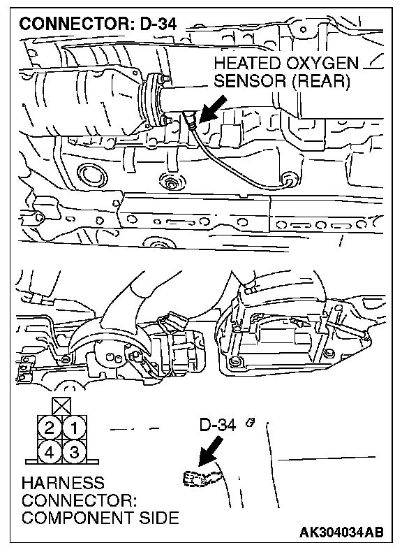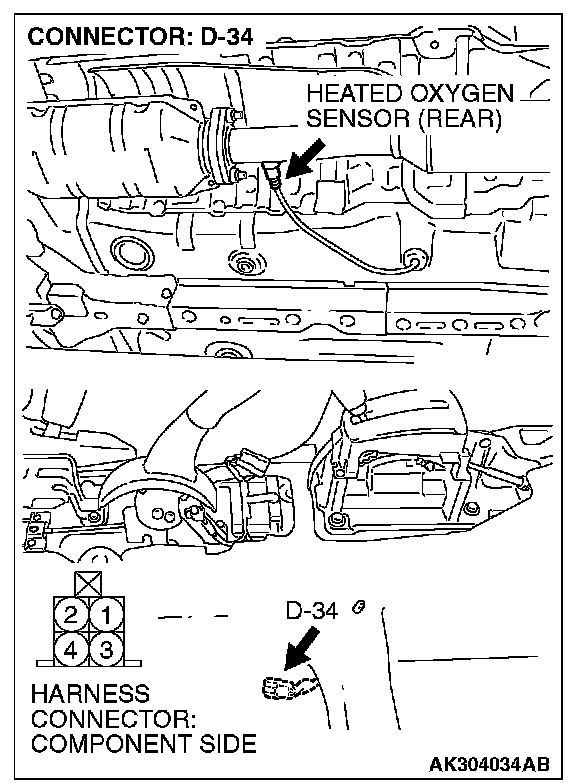 1. Disconnect the heated oxygen sensor (rear) connector D-34 and connect test harness special tool MB991658 to the connector on the heated oxygen sensor (rear) side.