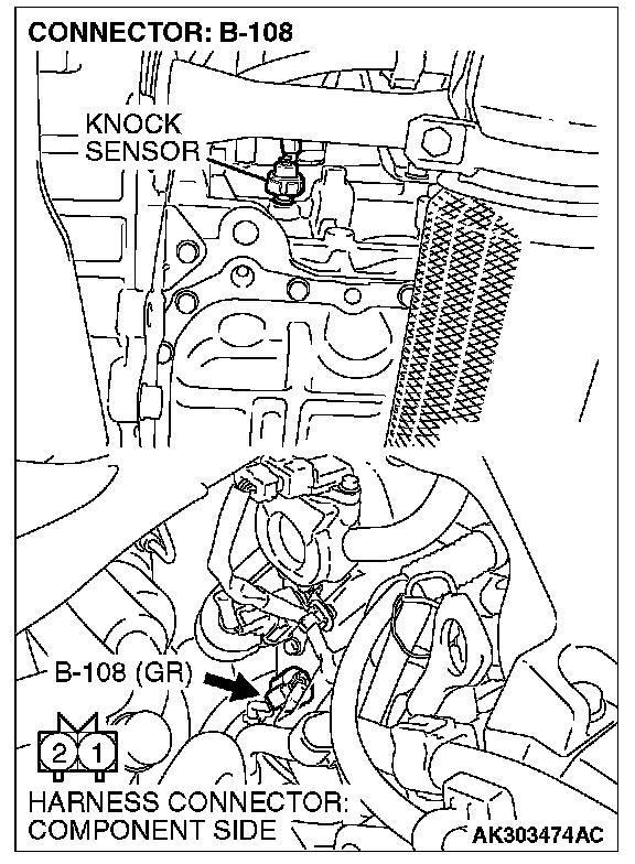 STEP 1. Check harness connector B-108 at the knock sensor for damage.