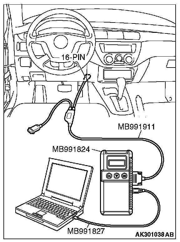 CAUTION: To prevent damage to scan tool MB991958, always turn the ignition switch to the "LOCK" (OFF) position before connecting or disconnecting scan tool MB991958.