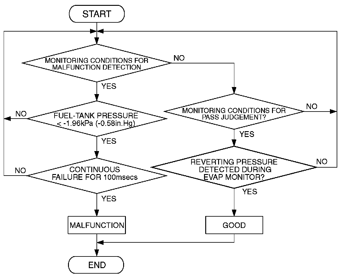 - The pressure in the fuel tank is -1.96 kPa (-0.58 in.Hg) or less for 0.1 second.