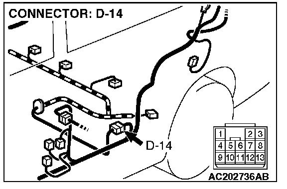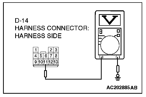 6. Measure the voltage between connector D-14 terminal 11 and ground by backprobing.