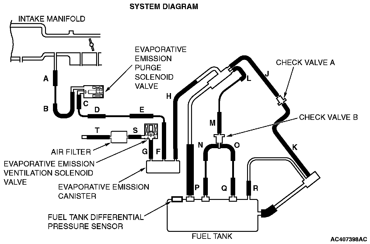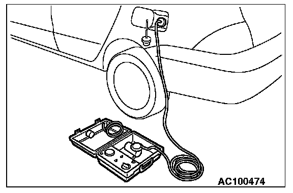 - To check for system blockage, do a performance test which uses a mechanical vacuum gauge and scan tool MB991958 set on the fuel tank differential pressure sensor (TANK PRS SNSR 73). The mechanical gauge reading is used to verify scan tool MB991958 reading. A comparison of the mechanical gauge with the reading on scan tool MB991958 will locate a problem in the system.