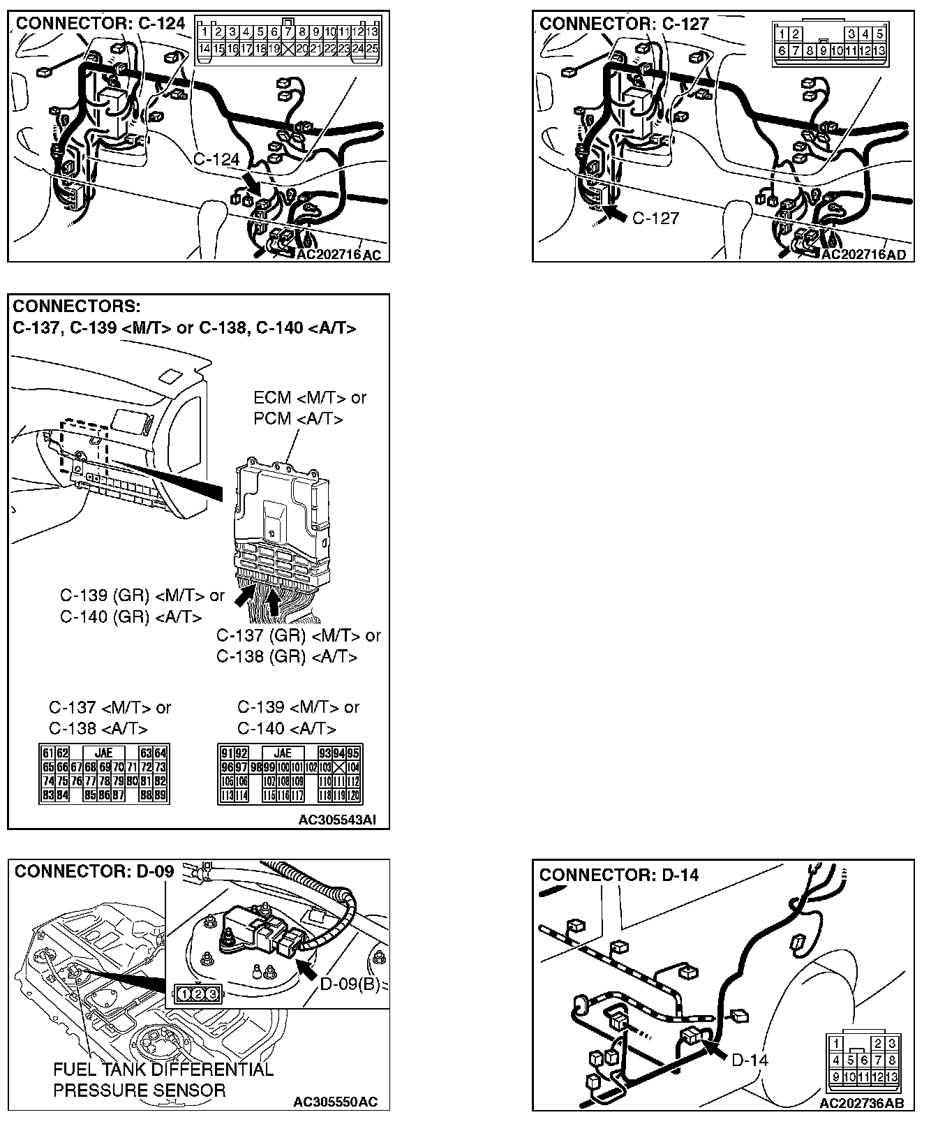 STEP 9. Check intermediate connectors C-105, C-124, C- 127, and D-14 and ECM connector C-139