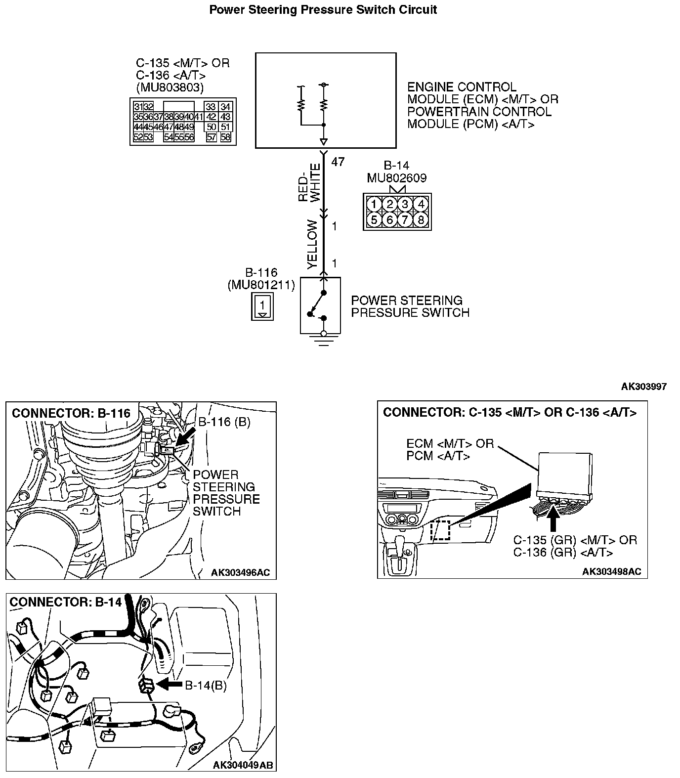 - A battery positive voltage is applied to the power steering pressure switch output terminal (terminal No. 1) from the ECM or the PCM (terminal No. 47) via the resistor in the ECM or the PCM .