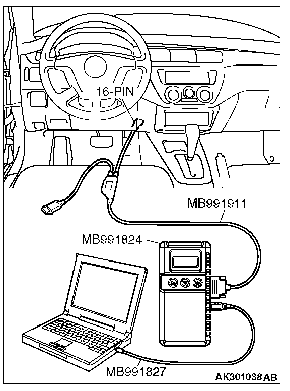 CAUTION: To prevent damage to scan tool MB991958, always turn the ignition switch to the "LOCK"(OFF) position before connecting or disconnecting scan tool MB991958.