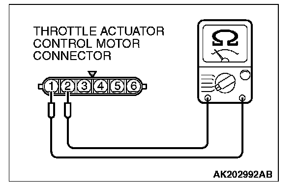 2. Measure the resistance between throttle actuator control motor side connector terminals No. 1 and No. 2.