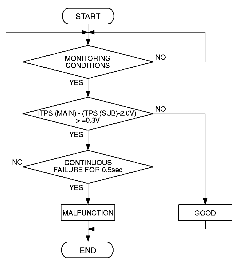 - Voltage obtained with the formula given below is 0.3 volt or higher for 0.5 second: throttle position sensor (main) output voltage - [throttle position sensor (sub) output voltage] - 2 volts