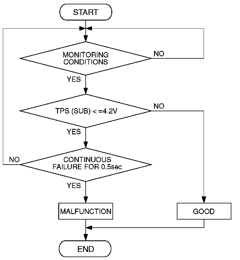 - Throttle position sensor (sub) output voltage is 4.2 volts or lower.