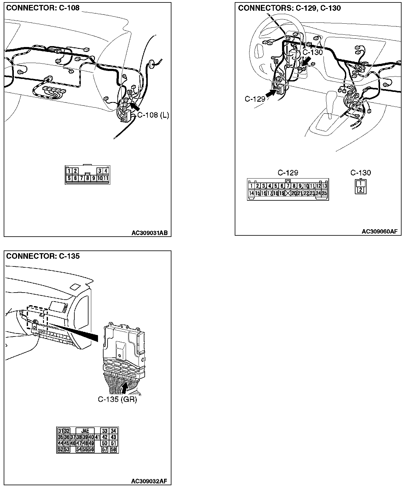 STEP 3. Check clutch pedal position switch connector C-130, ECM connector C-135, intermediate connectors C-108 and C-129 for loose, corroded or damaged terminals, or terminals pushed back in the connector.