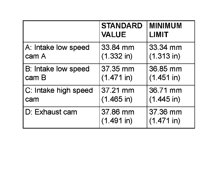 Measure the cam height. If it is below the limit, replace the camshaft.