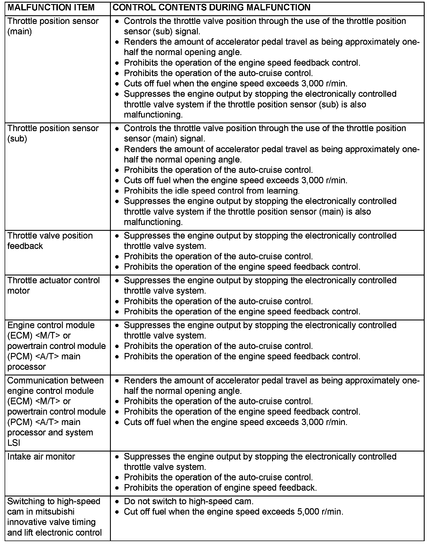 When the main sensor malfunctions are detected by the diagnostic test mode, the vehicle is controlled by means of the following defaults.