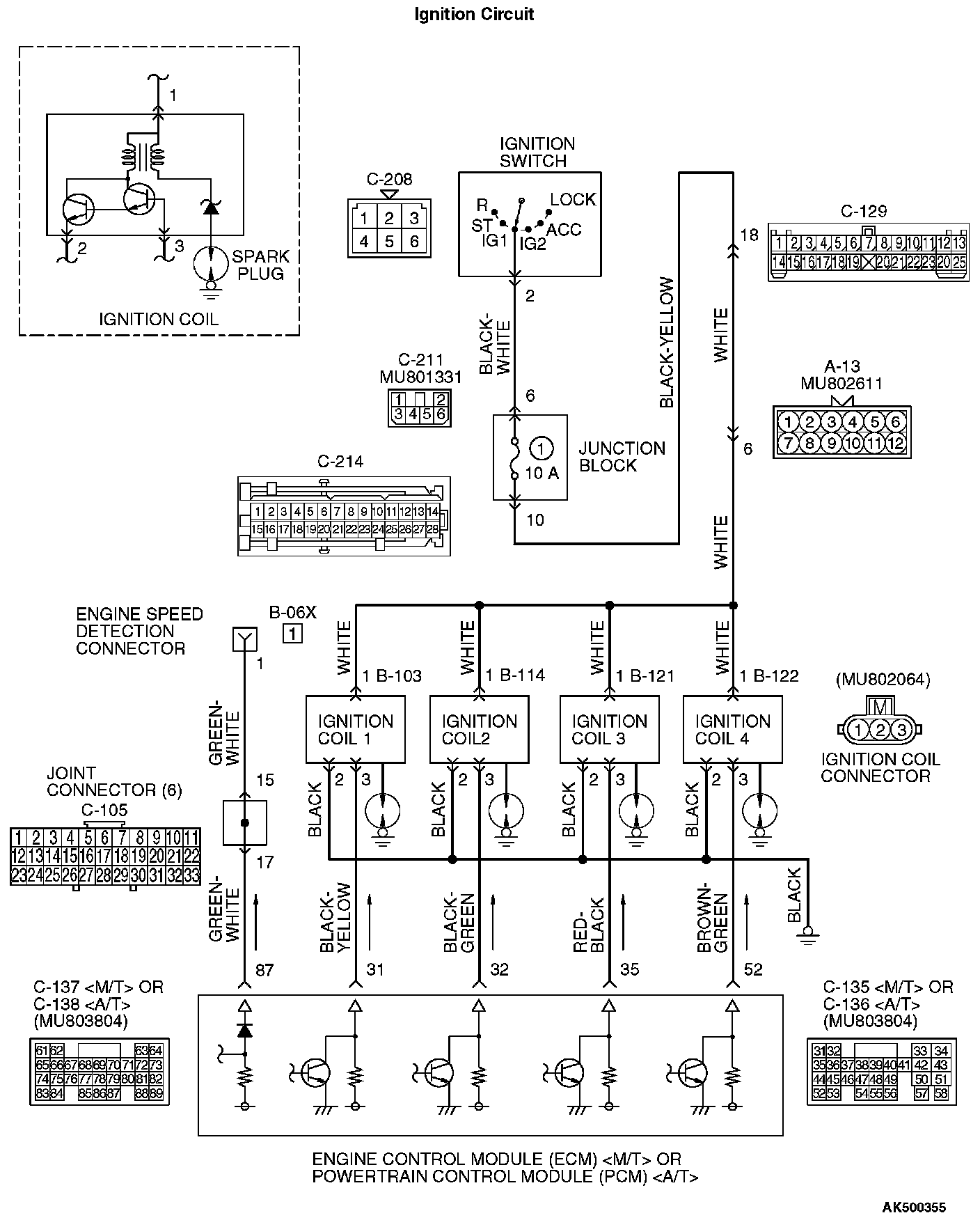 NO: Check the connectors A-13, C-129, C-211 and C-214 at intermediate connectors for damage, and repair or replace as required. If intermediate connector are in good condition, repair harness wire between ignition switch connector C-208 (terminal No.2) and ignition coil connector B-103, B-114, B-121, B-122 (terminal No. 1) because of open circuit. Then confirm that the malfunction symptom is eliminated.