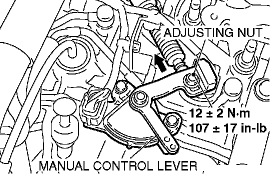 3. Gently push the transaxle control cable in the direction of the arrow, and then tighten the adjusting nut.