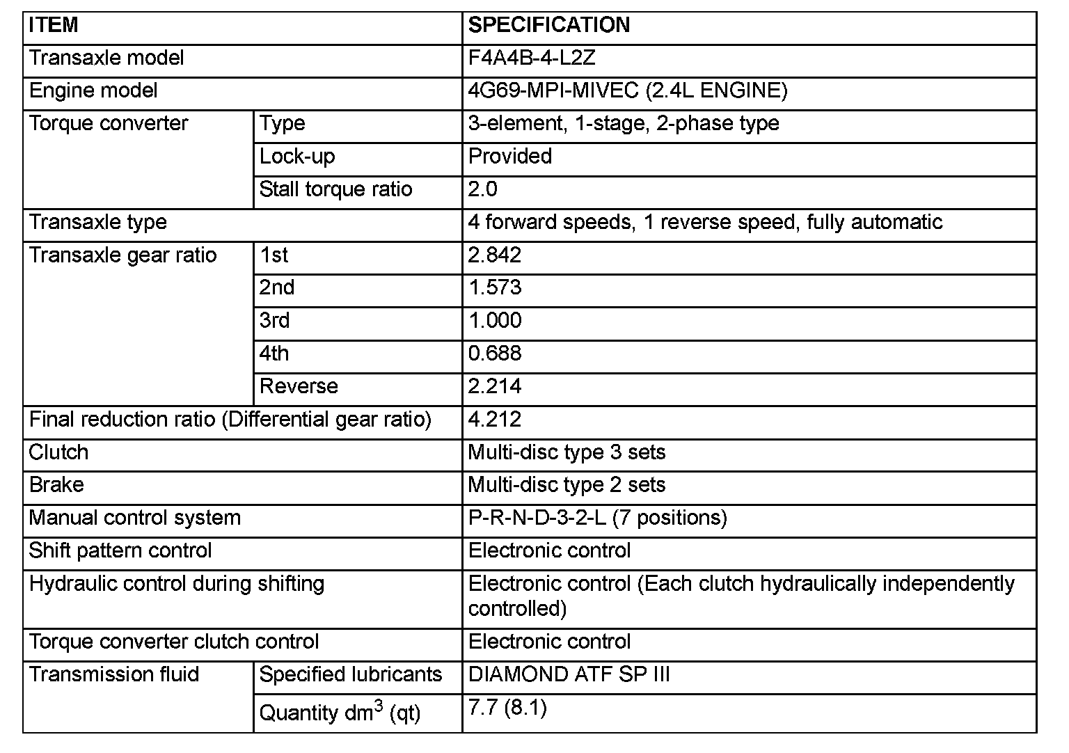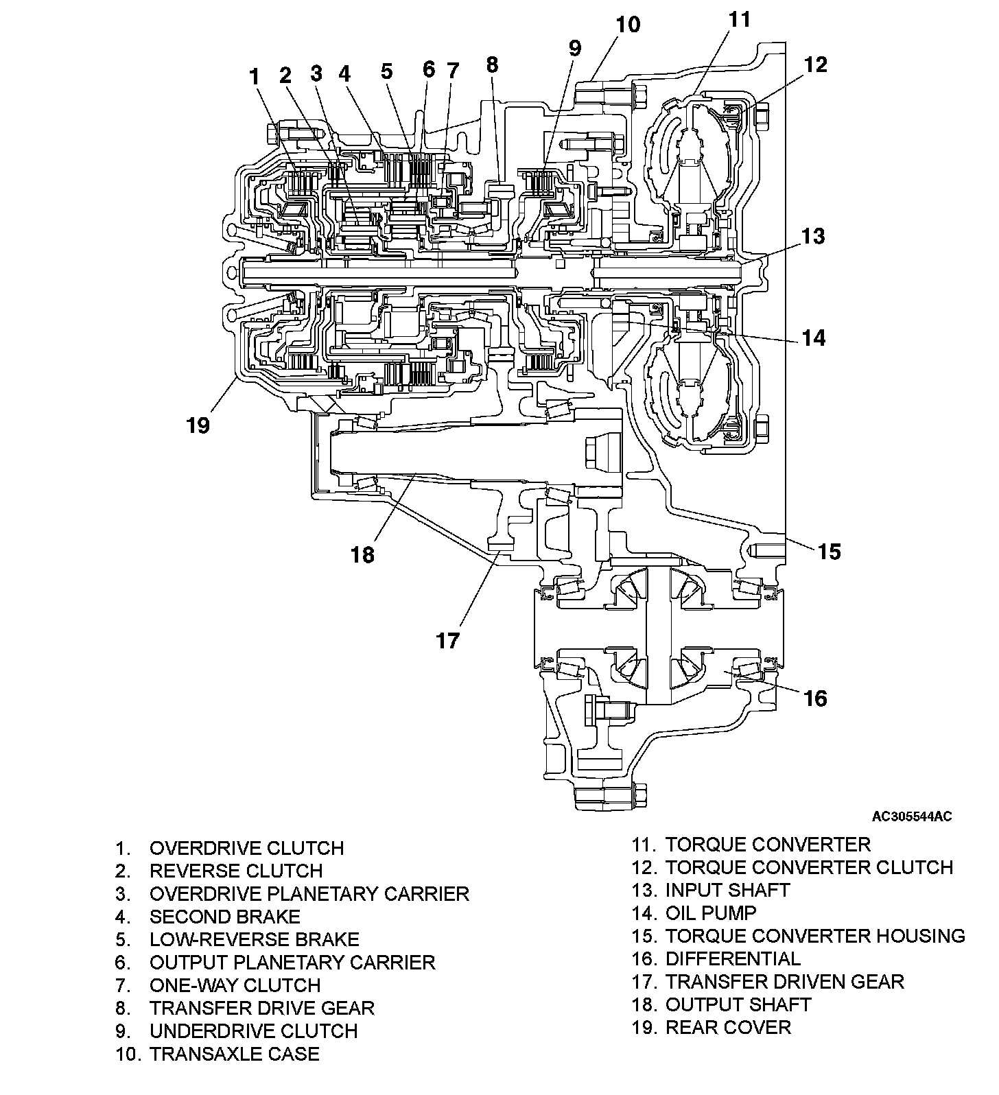 The transaxle is made up of the torque converter and gear train. A 3-element, 1-stage, 2-phase torque converter with built-in torque converter clutch is used. The gear train is made up of four sets of multi-disc clutches, two sets of multi-plate brakes, one set of one-way clutches and two sets of planetary gears. The planetary gears are made up of sun gears, carriers, pinion gears and annulus gears.