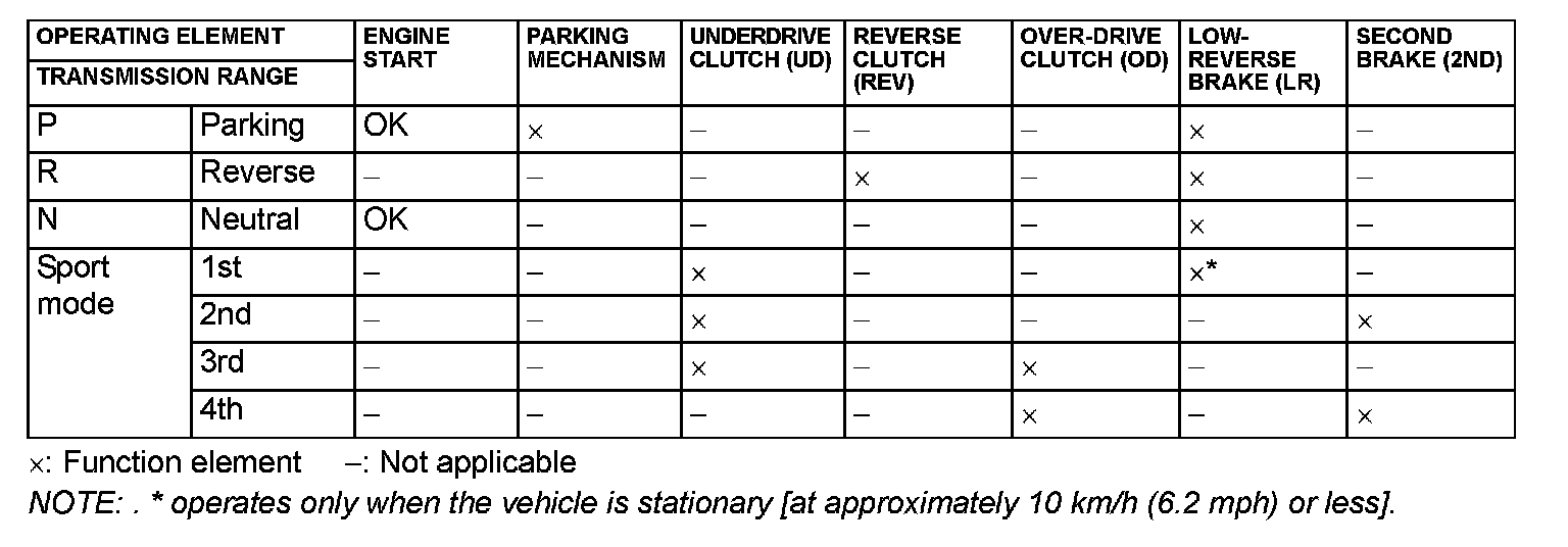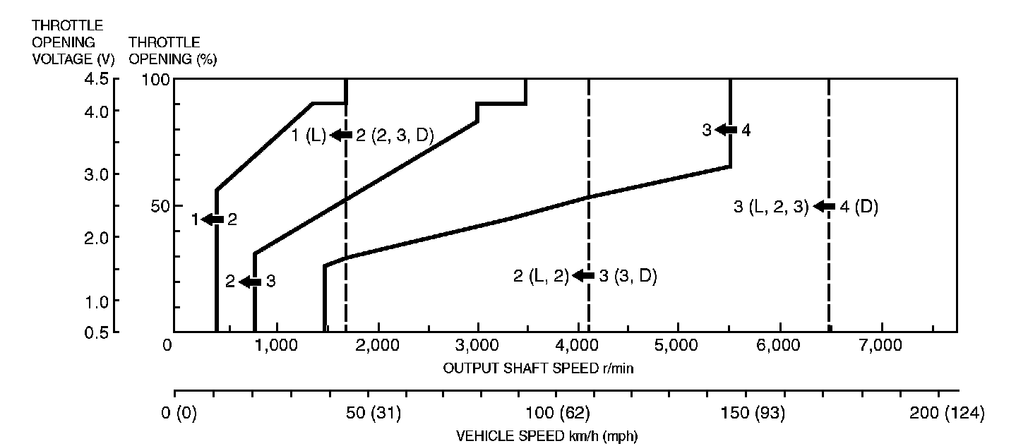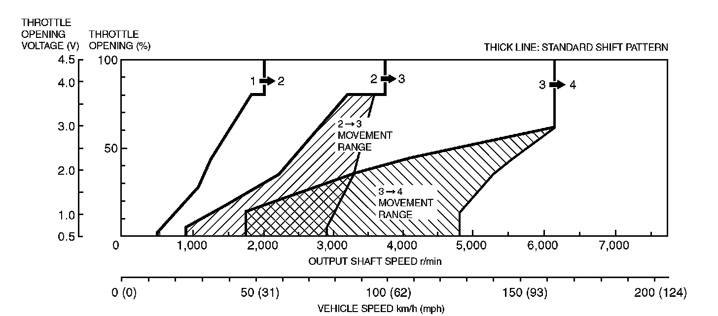 NOTE: Within 2-to-3 and 3-to-4 movement ranges, the PCM adjusts shift points according to the driving conditions by memorizing the accelerator pedal stroke and braking timing.