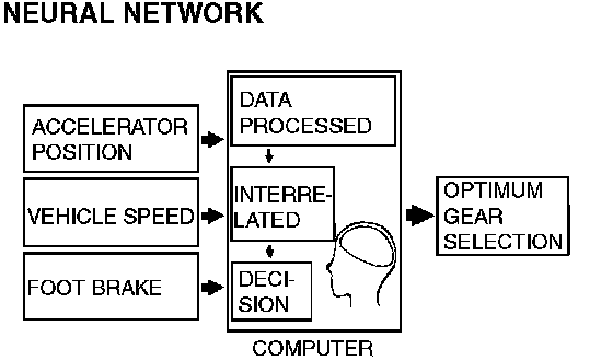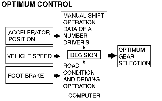 1. The shift patterns found satisfying by the typical driver for all ranges of driving are stored in the computer's memory. The computer uses this data to analyze road conditions and the driver's style of operation, and then outputs the optimal shift patterns stored in its memory to best match the conditions.
