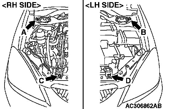 2) Set special tool MB991928 (engine hanger) to the front fender assembling bolts (A and B) and radiator support upper insulator attaching bolts (C and D) as shown.