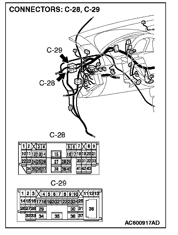 NOTE: Also check intermediate connector C-28 and C-29 for loose, corroded, or damaged terminals, or terminals pushed back in the connector. If intermediate connector C-28 and C-29 are damaged, repair or replace the damaged component(s) as described in Harness Connector Inspection.