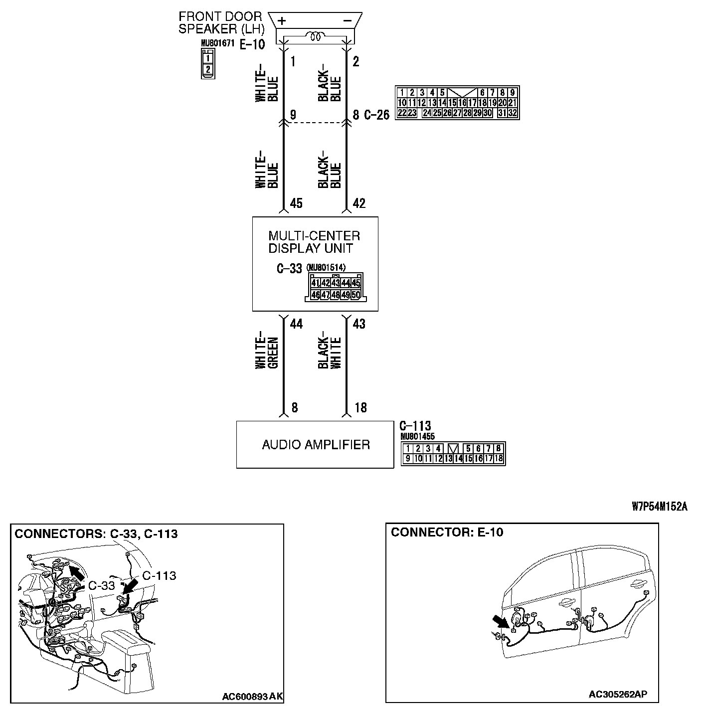 STEP 3. Check the wiring harness between front door speaker (LH) connector E-10 (terminals 1 and 2) and multi-center display connector C-33 (terminals 45 and 42).