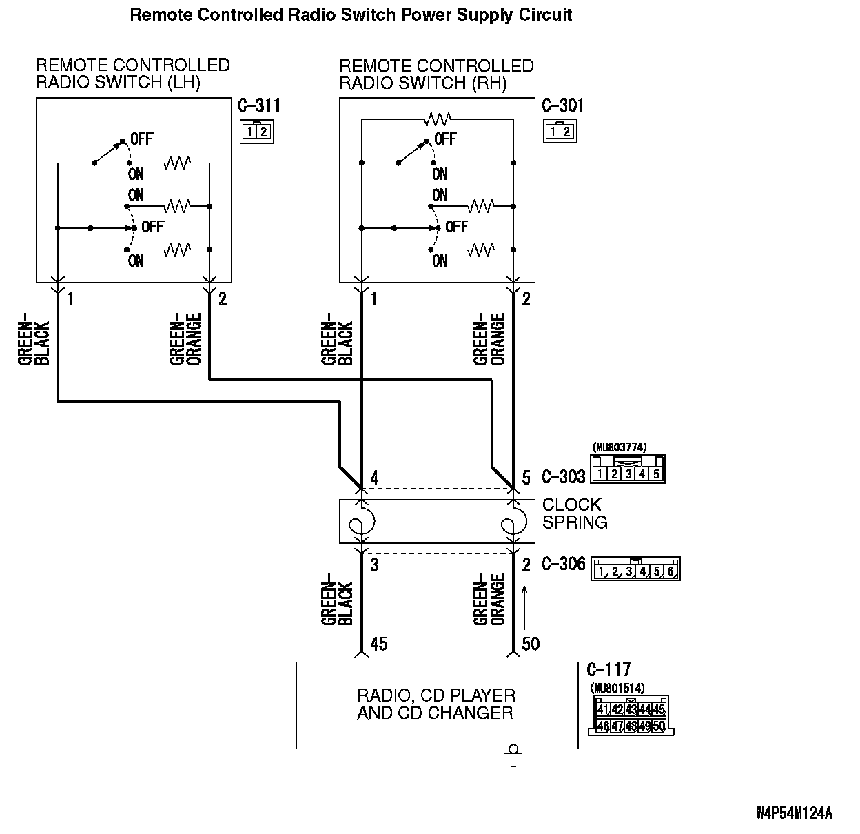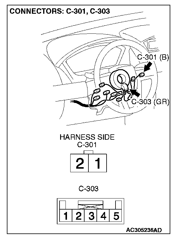 STEP 10. Check the wiring harness between clock spring connector C-303 (terminals 4 and 5) and remote controlled radio switch (RH) connector C-301 (terminals 1 and 2).