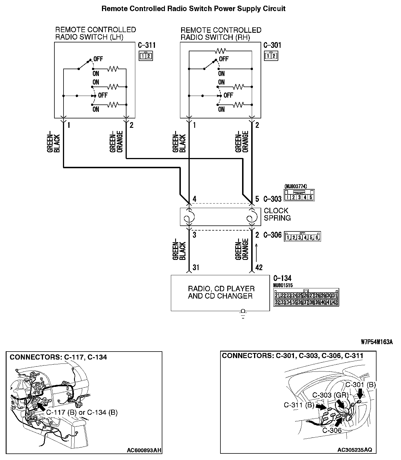 Q: Are clock spring connector C-303 and remote controlled radio switch (RH) connector C-301 in good condition?
