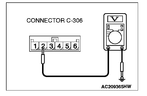 3. Measure the voltage between clock spring connector C-306 (radio, CD player and CD changer side) terminal 2 and ground.
