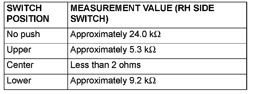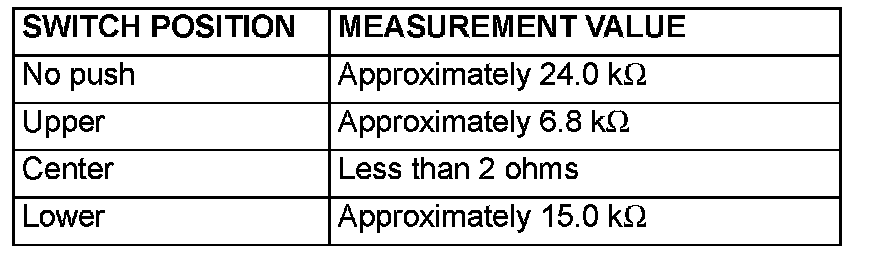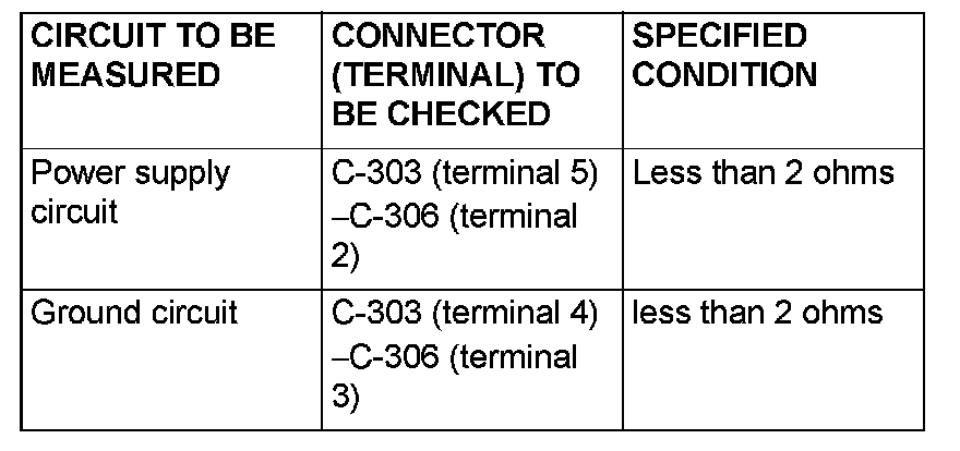 2. Measure the resistance between clock spring connector C-306 (clock spring side) terminals 2 and 3. Operate the right and left remote controlled radio switches, and check that the table above is satisfied.