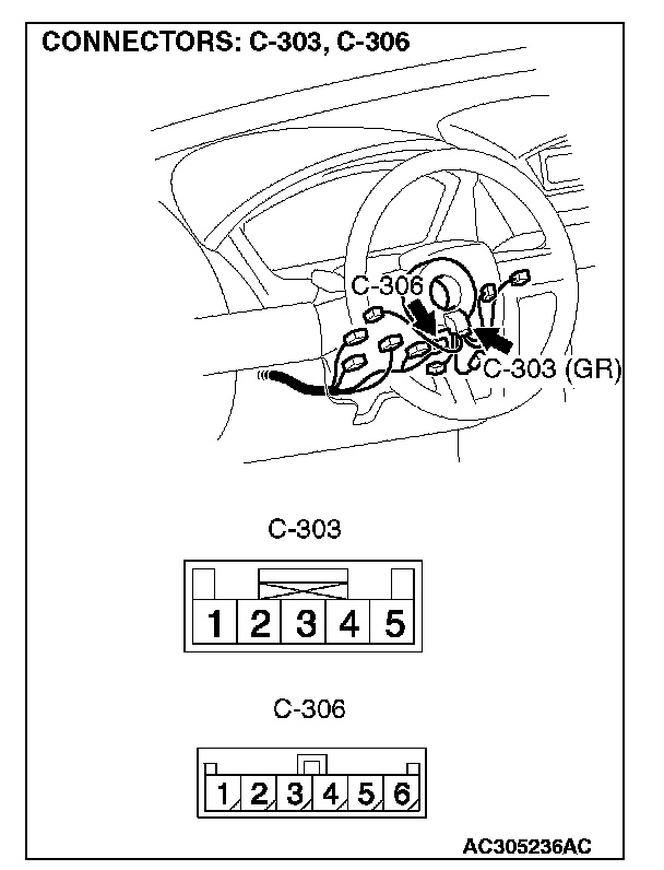 2. Measure the resistance at clock spring connectors C-303 and C-306.