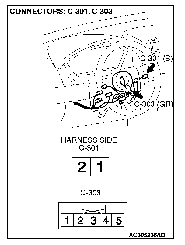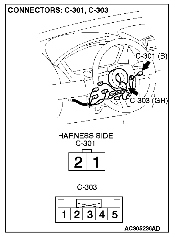 STEP 3. Check the wiring harness between remote controlled radio switch (RH) connector C-301 (terminals1 and 2) and clock spring connector C-303 (terminals 4 and 5).