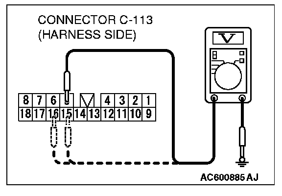 STEP 3. Check the wiring harness between audio amplifier connector C-113 (terminal 5, 15 and 16) and the battery.