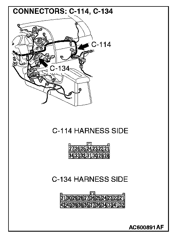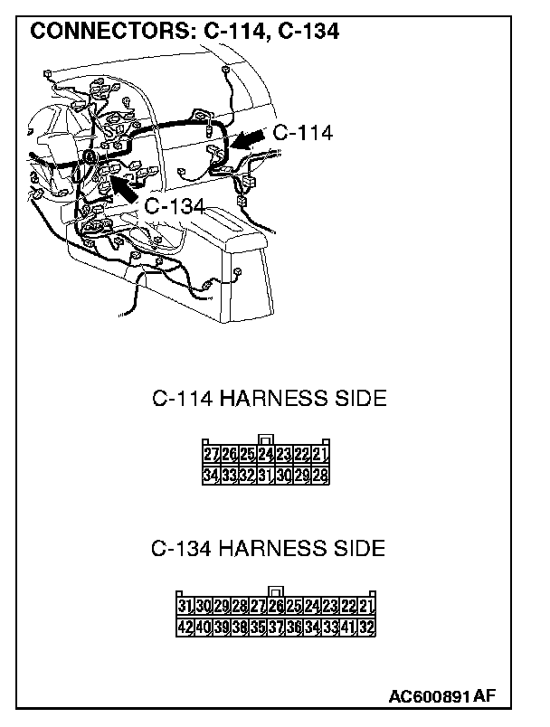 STEP 7. Check radio, CD player and CD changer connector C-134 and audio amplifier connector C-114 for loose, corroded or damaged terminals, or terminals pushed back in the connector.